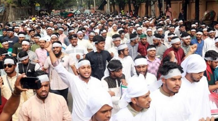 শুক্রবার ১৮ এপ্রিল জুম্মার নামাজ শেষে তেজগাঁও পলিটেকনিক থেকে কাফনের কাপড় মাথায় বেঁধে মিছিল করেন আন্দোলনরত শিক্ষার্থীরা।