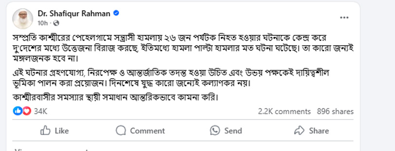 পোস্টে জামায়াত আমির লেখেন, সম্প্রতি কাশ্মীরের পেহেলগামে সন্ত্রাসী হামলায় ২৬ জন পর্যটক নিহত হওয়ার ঘটনাকে কেন্দ্র করে দু’দেশের মধ্যে উত্তেজনা বিরাজ করছে। ইতোমধ্যে হামলা পাল্টা হামলার মতো ঘটনা ঘটেছে। তা কারও জন্যই মঙ্গলজনক হবে না।