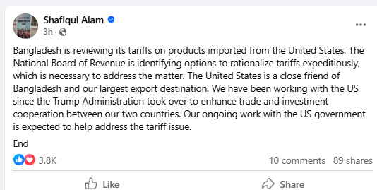 বৃহস্পতিবার সকাল ৮টা ৩২ মিনিটে ফেসবুকে এক পোস্টের মাধ্যমে এর প্রতিক্রিয়ায় প্রধান উপদেষ্টার প্রেস সচিব জানান, বাংলাদেশ যুক্তরাষ্ট্র থেকে আমদানিকৃত পণ্যের ওপর আরোপিত শুল্ক পর্যালোচনা করছে বাংলাদেশ।