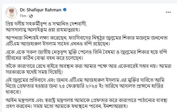 এই জুলুমের প্রতিবাদে এবং এ টি এম আজহারুল ইসলামের মুক্তির দাবিতে আমি নিজে গ্রেফতার হওয়ার জন্য ২৫ ফেব্রুয়ারি আদালত প্রাঙ্গণে হাজির থাকব।