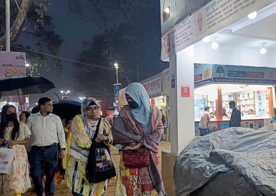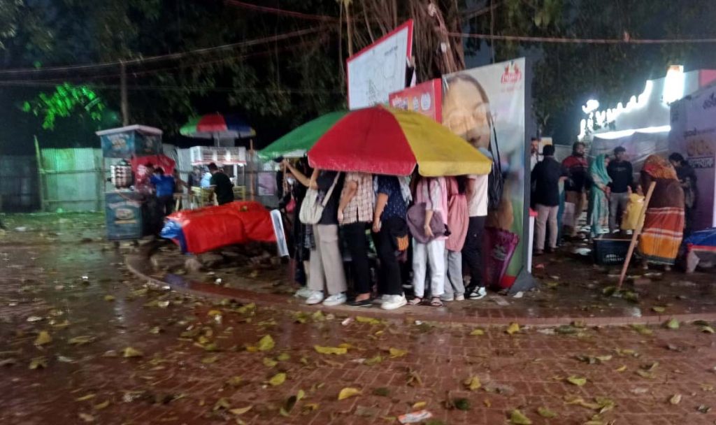 এ সময় স্টলের বিক্রয়কর্মীরা পলিথিন দিয়ে বই মোড়াতে ব্যস্ত হয়ে পড়েন। পাঠক-দর্শনার্থীরা খুঁজছিলেন নিরাপদ আশ্রয়।