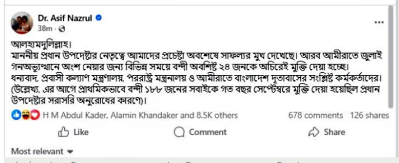 ফেসবুক পোষ্টে প্রবাসী কল্যাণ উপদেষ্টা লেখেন, ‘আলহামদুলিল্লাহ। মাননীয় প্রধান উপদেষ্টার নেতৃত্বে আমাদের প্রচেষ্টা অবশেষে সাফল্যর মুখ দেখেছে। আরব আমিরাতে জুলাই গণ–অভ্যুত্থানে অংশ নেওয়ার জন্য বিভিন্ন সময়ে বন্দি অবশিষ্ট ২৪ জনকে অচিরেই মুক্তি দেওয়া হচ্ছে।