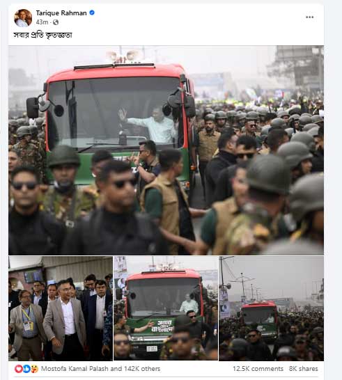 সেখানে সংক্ষিপ্ত আনুষ্ঠানিকতা শেষে বুলেট প্রুফ বাসে চড়ে জুলাই ৩৬ এক্সপ্রেসওয়েতে (৩০০ ফিট) অভ্যর্থনা অনুষ্ঠানে যাচ্ছেন তারেক রহমান।