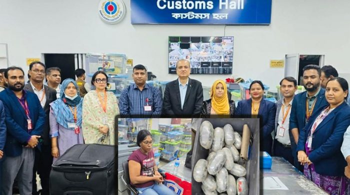 ।।বিকে রিপোর্ট।।ঢাকার শাহজালাল আন্তর্জাতিক বিমানবন্দরে বিদেশি নারী যাত্রীর লাগেজ থেকে প্রায় ৮ কেজি ৬৬০ গ্রাম কোকেন জব্দ করেছে কাস্টমস গোয়েন্দা ও তদন্ত অধিদপ্তর। যার আনুমানিক বাজারমূল্য প্রায় ১৩০ কোটি টাকা।