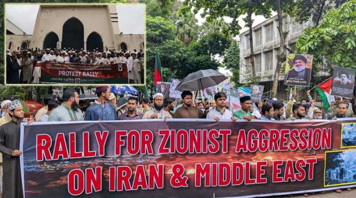 ।।বিকে রিপোর্ট।।ইরানে ইসরায়েলি হামলাসহ অব্যাহত গণহত্যার প্রতিবাদে রাজধানী ঢাকায় প্রতিবাদী সমাবেশ ও বিক্ষোভ মিছিল হয়েছে। শুক্রবার ২০ জুন পবিত্র জুমার নামাজ শেষে রাজধানীর বায়তুল মোকাররমের উত্তর গেটে সমাবেশ ও বিক্ষোভ
